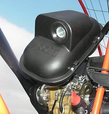 The engine can be start comfortably with just one hand. On account of the over-head-position you can operate powerfully the manual starter. The flash starter from Polini is now standard on this model. The new injection moulded case of the Polini Flash Starter has been designed to be compact in size and lightness. But it's main feature is the effortless energy now needed to start the Thor engine even with it on your back or in flight. Polini Flash Starter is an advanced starting system, based on the mechanical arrangement of special springs. This new system is capable of reducing the starting effort by 75% and reducing the painful effects of compression kick-back.